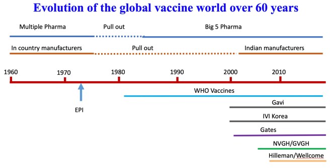 Partly in response, The WHO created the Expanded Programme on Immunisation (EPI) for common childhood diseases (16). Tore Godal and other global influencers, then created the Global Alliance for Vaccines and Immunisation (https://www.gavi.org), dedicated to providing vaccines to those who could not afford them. This created a market pull for vaccines where one had not existed. Indian entrepreneurs, recognising a business gap, set up companies to make low-cost generic vaccines for the Indian market e.g. Serum Institute of India (https://www.seruminstitute.com) and Biological E (http://www.biologicale.com). Initially, these businesses were largely ignored by western companies, but in time they would grow into power houses in their own right and now challenge the global market. India has an enormous vaccine manufacturing capacity, now proving vital in COVID times.